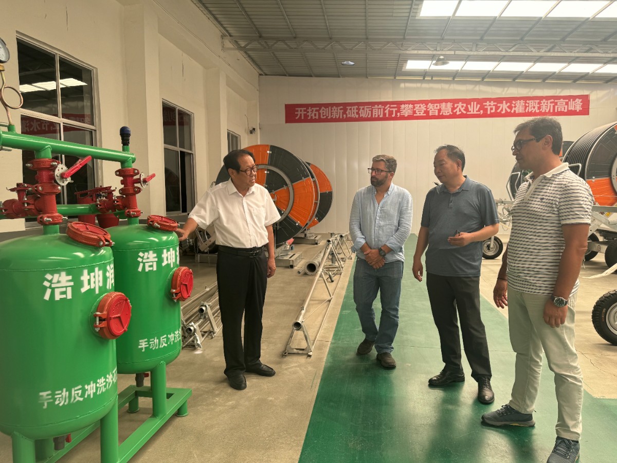 六月十一日上午,葡萄牙國客商來浩坤潤土公司 考察,洽談購買智能水肥一體機,大型指針式、平移式噴灌機,卷盤式智能噴灌機等事項