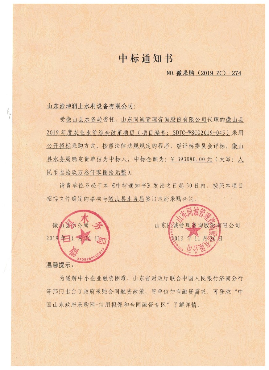 熱烈祝賀山東浩坤潤土水利設備有限公司中標“微山縣2019年度農業(yè)水價綜合改革項目”